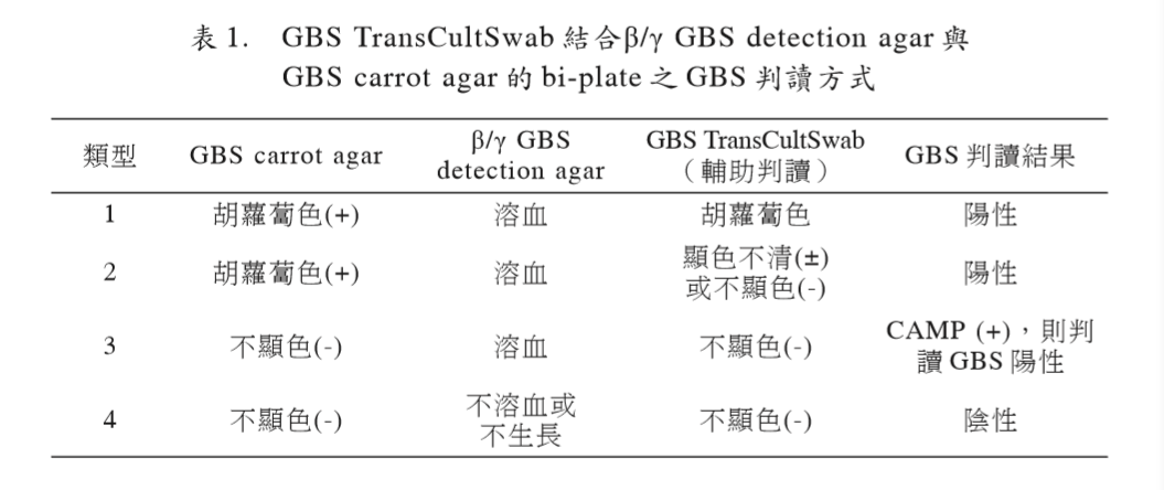 broth需額外插入加強(qiáng)顯色紙條,因 此 GBS TransCultSwab的操作堪稱簡易、方 便與親民(user friendly)。另外,GBS Trans CultSwab移種的分隔平板中GBS carrot agar 偵測 -溶血型GBS的特異性高達(dá)100%[11], 因此,任何橘~紅色的生長菌落可借著顯色特征快速檢出GBS。GBS除了 -溶血型外, 尚有3~5%屬于非( )溶血型[3],此可藉者分 隔平板的 / GBS detection agar快速偵測, 因此,檢測套組對GBS的偵測是全面性的, 雖然美國Hardy Diagnostics已研發(fā)可用于偵 測 溶血型GBS的區(qū)分性培養(yǎng)基-GBS DetectTM (平板培養(yǎng)基),發(fā)現(xiàn) 溶血型 GBS 從孕婦 檢體的檢出率為3.9% (24/619),但因其偽陽 性高達(dá)58% (62/107)[8],將導(dǎo)致檢驗(yàn)人力的浪費(fèi)及偽陽性的產(chǎn)生,綜合以上及本研究之