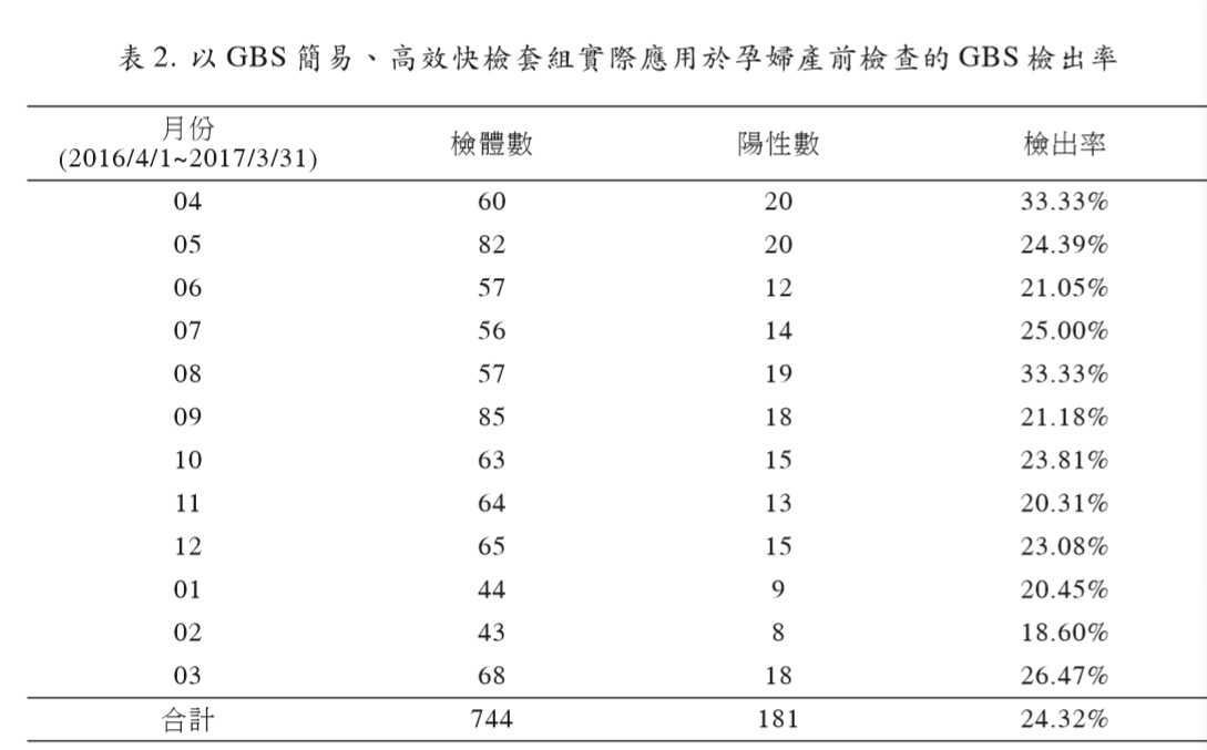 agar / GBS carrot agar 分隔平板)在12個(gè)月 間共評估744 個(gè)臨床產(chǎn)前檢查檢體,結(jié)果發(fā) 現(xiàn)孕婦的 GBS 檢出率(陽性率)為 24.32%