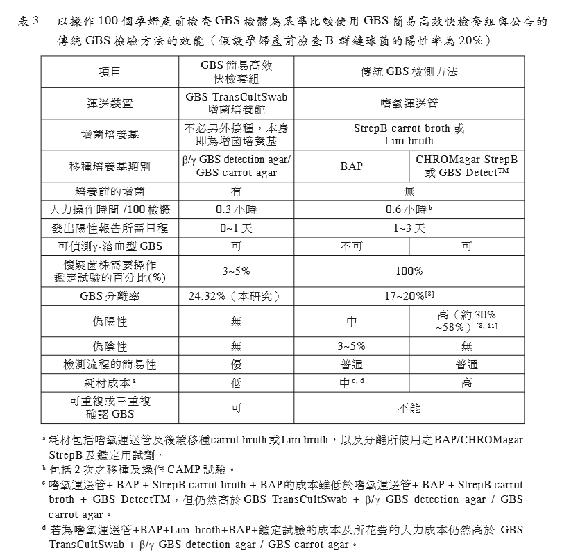 出率、報(bào)告時(shí)效、成本以及簡易性等項(xiàng)目皆 優(yōu)于公告的傳統(tǒng)GBS檢測方法。(表3)。