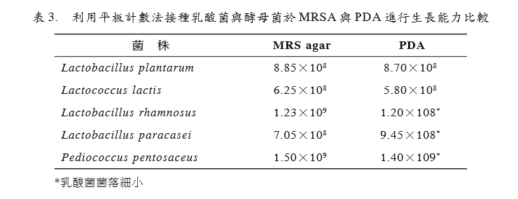為評估乳酸菌于PDA之生長狀況,本研 究將乳酸菌活化后經(jīng)序列稀釋至適當(dāng)稀釋倍 數(shù)后以傾注培養(yǎng)于MRSA及PDA,結(jié)果如表 3 所示,乳酸菌以傾注平板法接種于 MRS agar 及 PDA,乳酸菌于兩種培養(yǎng)基皆可生 長,并且其菌落數(shù)目無明顯差異。乳酸菌于 MRSA培養(yǎng)基上生長活性較佳,菌落呈白色 明顯肉眼可見,但由于PDA是霉菌與酵母菌