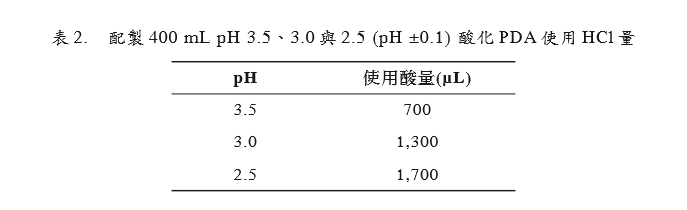 酸化馬鈴薯葡萄糖洋菜培養(yǎng)基(酸化 PDA) 制備 將 PDB 粉末加入總體積2% Agar,以 121℃高溫高壓滅菌15分鐘,冷卻至45-50℃, 加入先前制備好之酸液由pH 5.1調(diào)整pH至 3.8、3.5、3.0與 2.5。 酸化 PDA 配制方法經(jīng)預(yù)實驗結(jié)果如表 1,不同酸液調(diào)整至pH 3.8 (±0.1)使用酸液量