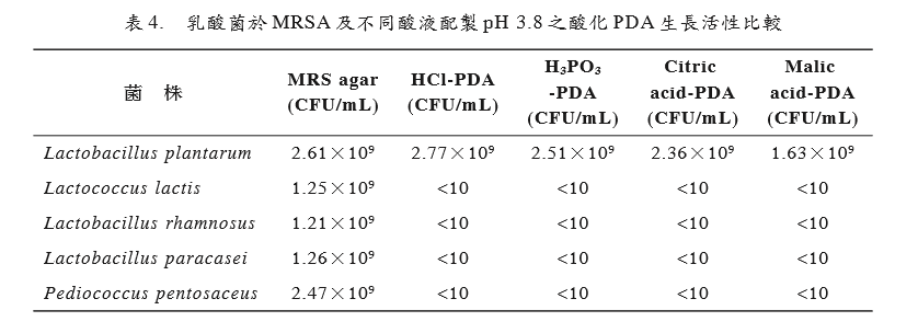 通用培養(yǎng)基,乳酸活菌雖然可以生長于此培 養(yǎng)基上,但對于部分乳酸菌較為不適,而生 長出的乳酸菌菌落形態(tài)會偏細小,較不易計 數(shù)。 藉由不同酸液調(diào)整至 pH 3.8之 PDA 確 認乳酸菌于一般酸化PDA生長活性。由表4 結(jié)果顯示部分乳酸菌由調(diào)整至pH 3.8 PDA傾 注培養(yǎng)幾乎沒有活性,但是 Lactobacillus
