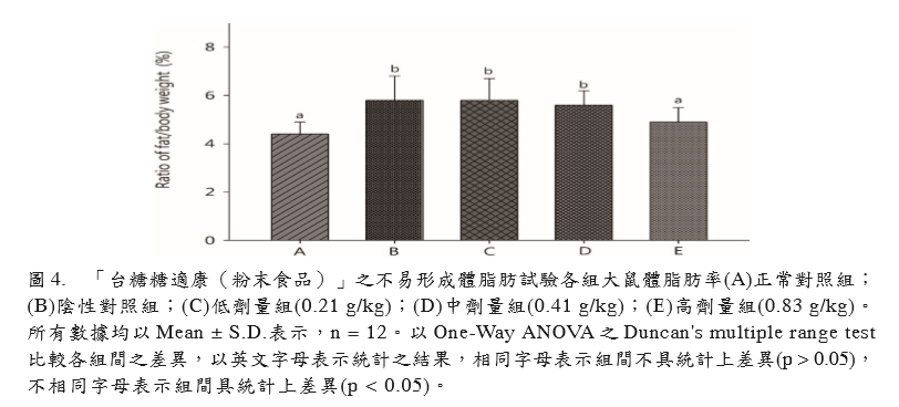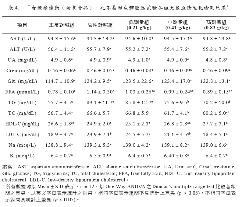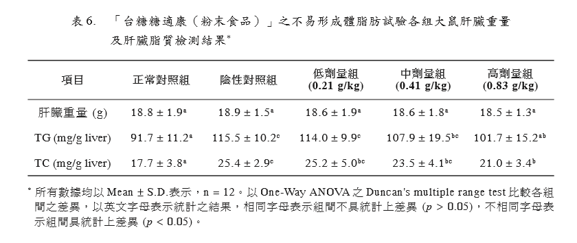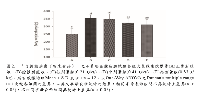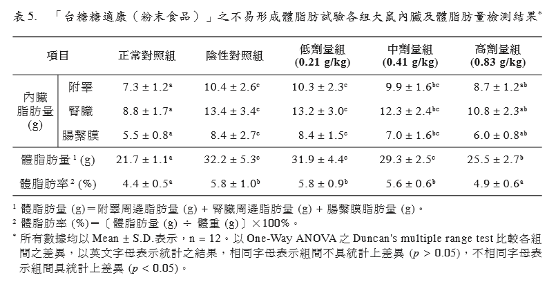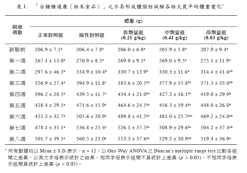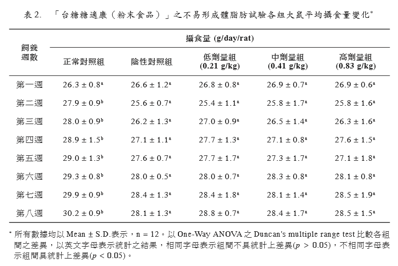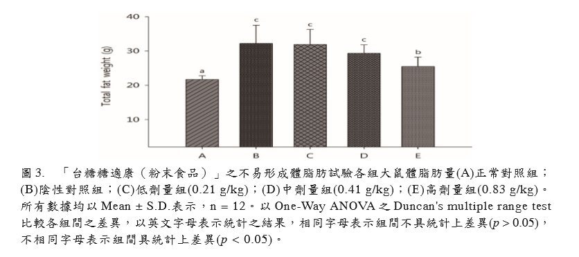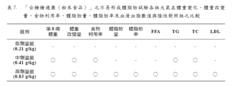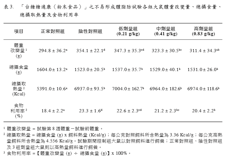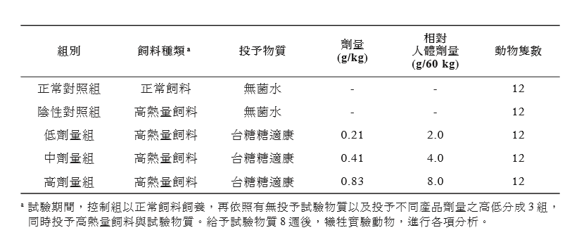 形。試驗(yàn)期間同時(shí)投予試驗(yàn)物質(zhì)「臺(tái)糖糖適 康(粉末食品)」,以評(píng)估其是否具有不易 形成體脂肪之功能。3 組劑量組試驗(yàn)物質(zhì)投